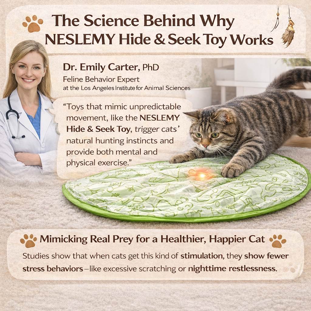 “Cats are natural-born hunters, and their brains and bodies are built for short bursts of intense activity — just like when they're hunting in the wild. Toys that mimic unpredictable movement, like the hide-and-seek action in the NESLEMY Hide & Seek Toy, trigger their natural hunting instincts and give them a great workout for both their body and mind. Studies show that when cats engage with toys like this, they play longer, stay more focused, and show fewer stress behaviors—like excessive scratching or nighttime restlessness. The closer a toy gets to mimicking real prey, the better it is for a cat's overall well-being.”