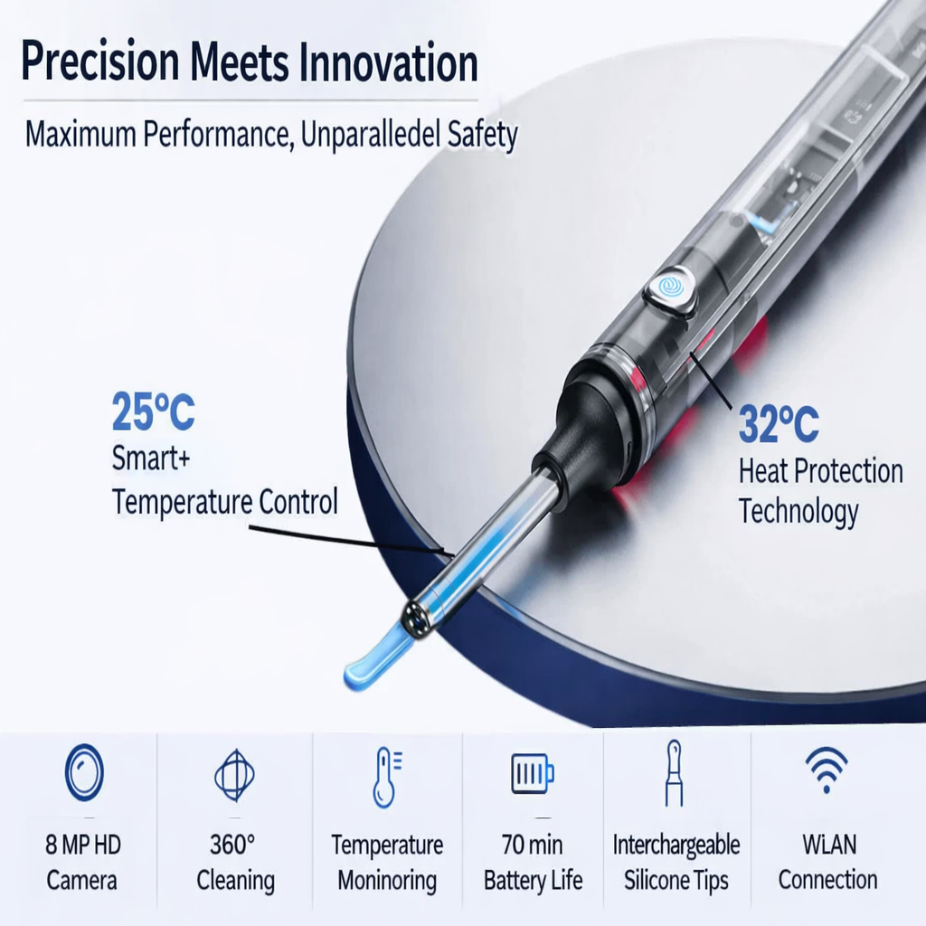 INTEGRATED METAL BODY & SKIN-FRIENDLY EAR SPOON: The ear spoon is made of metal for durability and features a skin-friendly design for comfortable use. Its non-slip body ensures a secure grip, while intelligent temperature control prevents overheating, guaranteeing gentle yet effective ear cleaning.