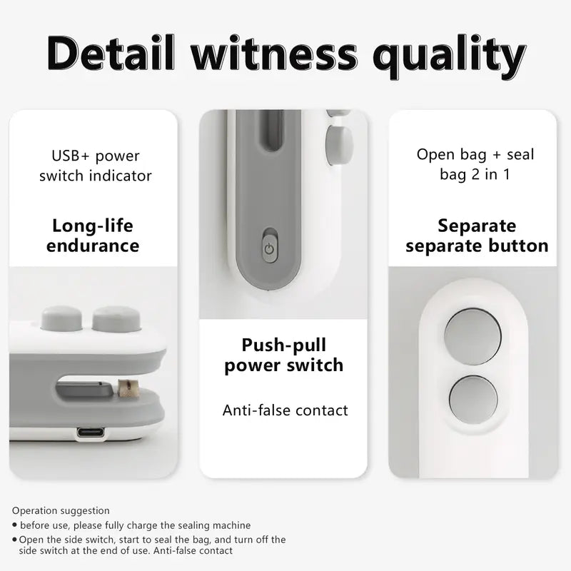 While the Mini Bag Sealer is perfect for dry snacks, fruits, and vegetables, it is not designed for sealing liquids or foods with significant moisture. For best results, make sure the bag is dry before sealing. This ensures the heat-sealing technology works effectively and the bag stays sealed tightly. 💧