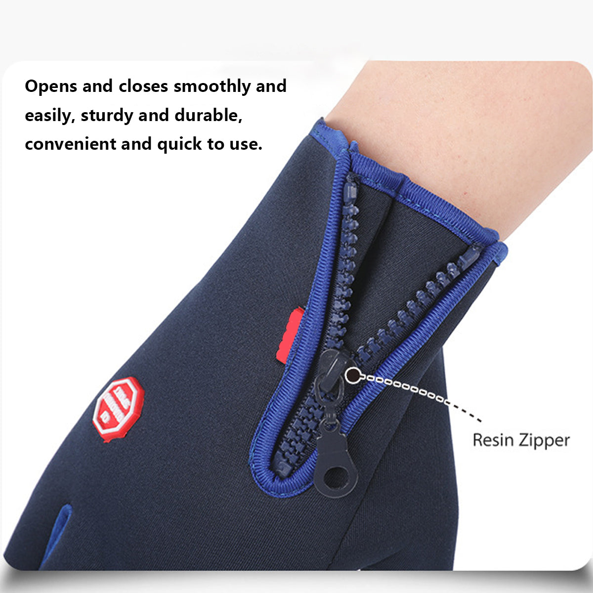 - Closure: Resin zipper + elastic cuff